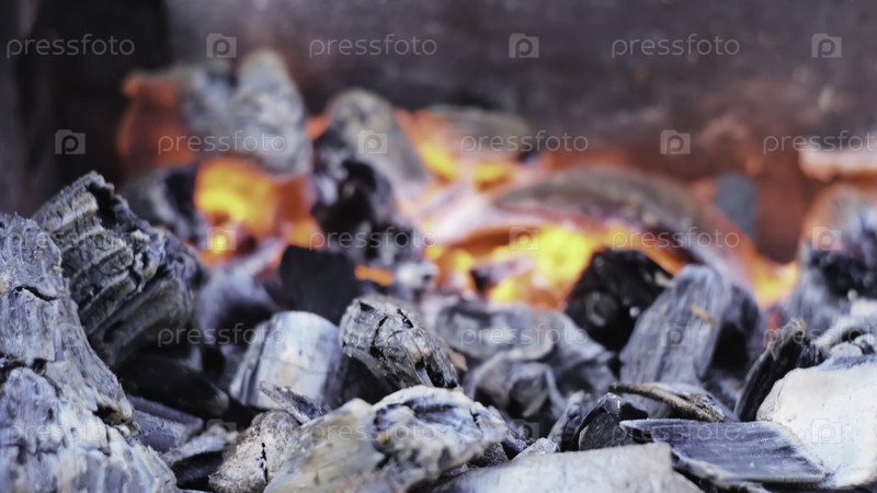 Близкий план светящихся углей для гриля. Концепция. Дымчатые горячие уголь на гриле перед приготовлением пищи. Нагретый уголь на барбекю