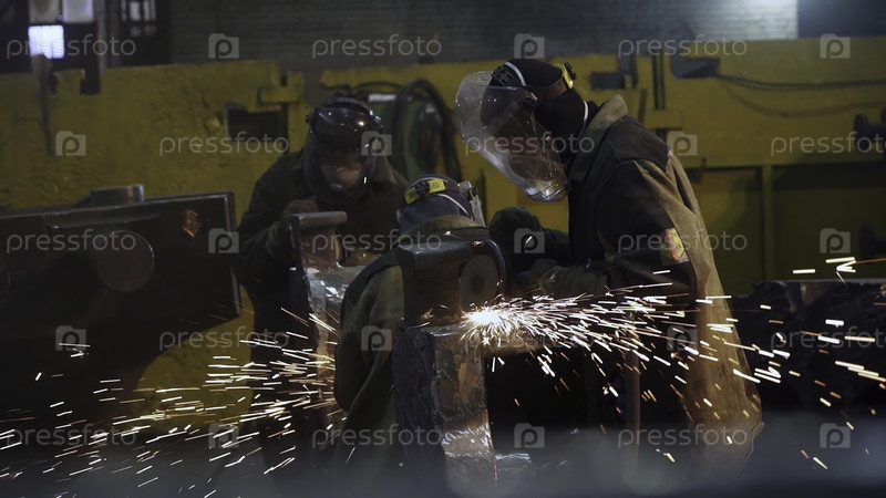 Работники в ярком защитном снаряжении умело работают с тяжелыми машинами, генерируя яркие искры в промышленной среде