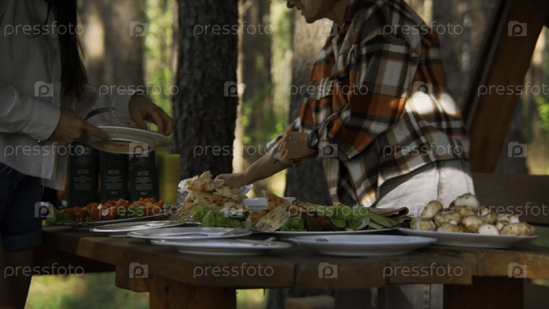 Мать и взрослая дочь, подающие на открытом воздухе деревянный стол. Стоковые кадры. Приготовление барбекю с семьей в летнем лесу