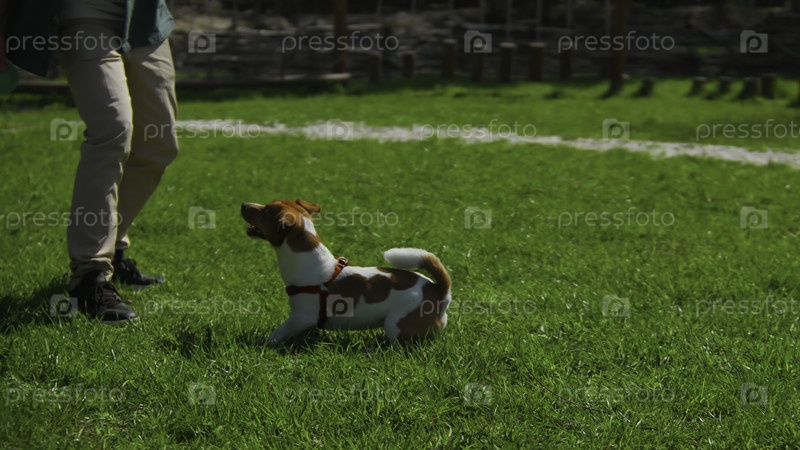 Мужчина играет в мяч с собакой в летний день. Скриншоты. Человек веселится, играя в мяч со своей собакой в парке. Мужчина играет со своей собакой на зеленой траве в парке летом