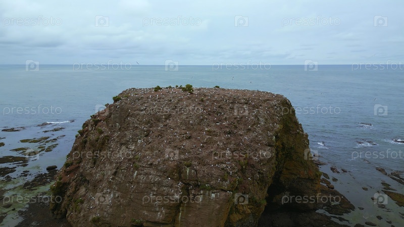 Морская скала с домом для чайков. Клип. Вид сверху морской обрыва с летающими чайками на фоне морского горизонта. Кинозрительный вид со скалами и чайками в море