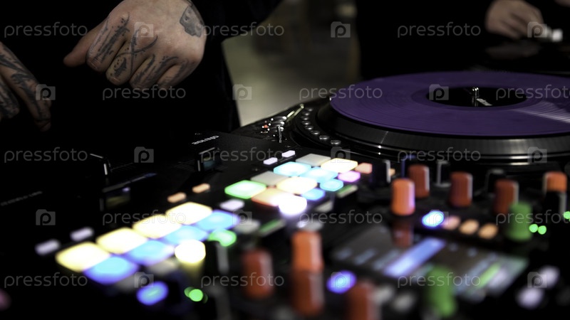 Берлин, Германия, 6 декабря 2022 года: Ближайшее изображение диджейской консоли, управляемой мужчиной с татуировками на пальцах и руках
