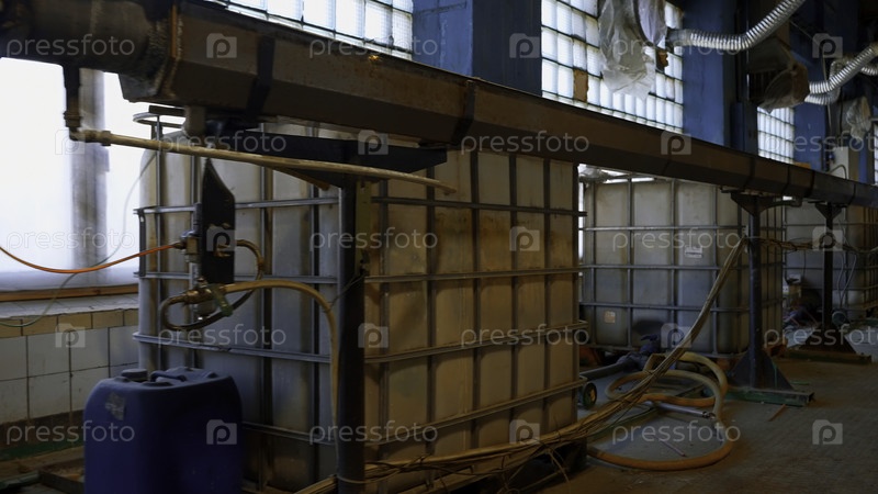 Вид изнутри мастерской старомодной фабрики.Креативное.Долгая труба, простирающаяся вдоль стены, промышленное оборудование