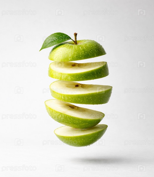 Парящее разрезанное зеленое яблоко на белом фоне — тонкие ломтики с листиком и каплями влаги, концептуальный студийный натюрморт