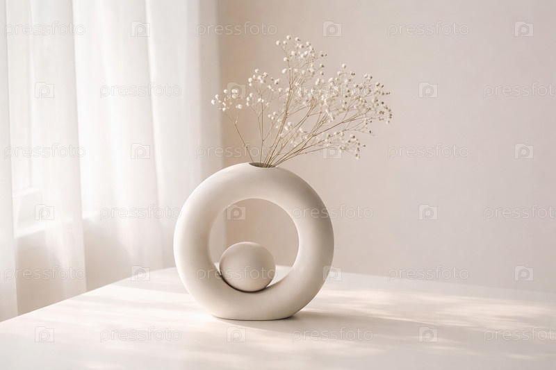 Минималистичная круглая керамическая ваза с декоративным шаром и веточками гипсофилы на светлом столе в пастельном интерьере