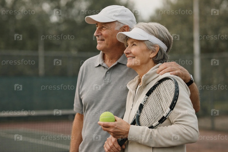 Пожилая пара на теннисном корте с ракеткой и мячом — совместная спортивная активность, поддержка и здоровый образ жизни на свежем воздухе