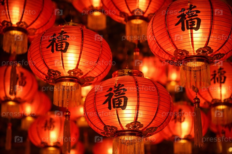 Крупный план традиционных красных китайских бумажных фонарей с иероглифом на празднике Китайского Нового года — теплое вечернее освещение, праздничная атмосфера и декоративный восточный декор
