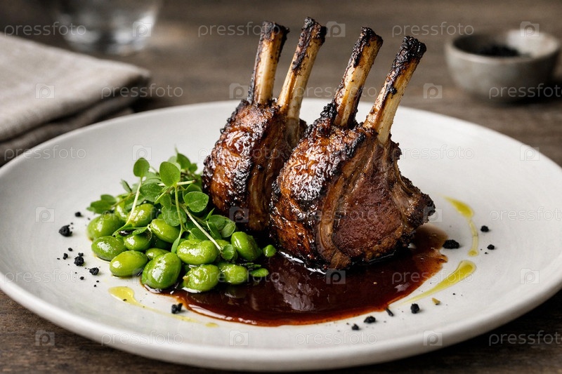 Ребрышки ягненка с карамелизированной корочкой на соусе-редукции, гарнир из зеленых бобов фава и микрозелени, ресторанная подача на белой тарелке
