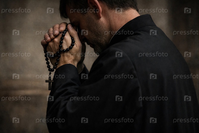 Мужчина в черной одежде молится, держит в руках черные четки с крестом — атмосферный кадр в церковном интерьере, момент сосредоточенной духовной молитвы