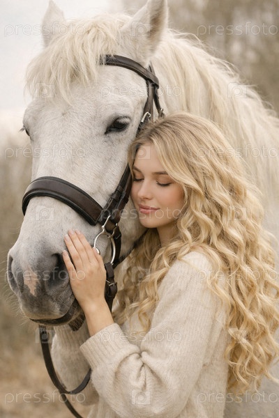 Женщина с длинными кудрявыми светлыми волосами нежно прижимает голову к белой лошади в загородной обстановке — портрет близости человека и животного, мягкое естественное освещение и пастельная цветовая гамма