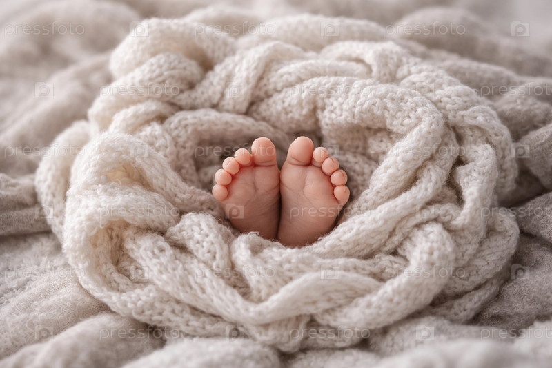 Нежные ножки новорожденного, аккуратно завернутые в вязаный кремовый плед — крупный план мягкой текстуры, уюта и теплоты семейного момента