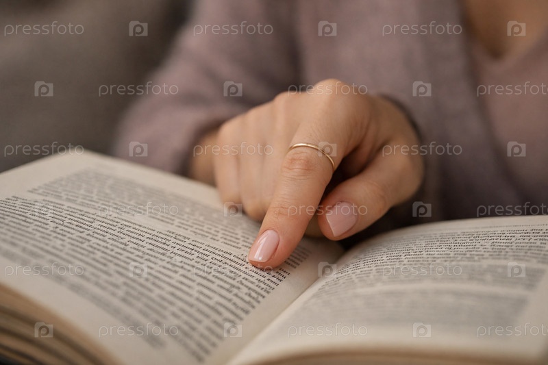 Крупный план женской руки с аккуратным маникюром и тонким золотым кольцом, указывающей пальцем на текст в открытой книге — домашнее чтение, концентрация и процесс изучения