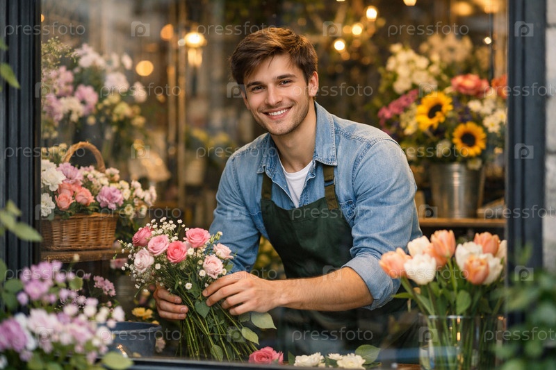 Флорист в джинсовой рубашке и зеленом фартуке аккуратно собирает букет из роз и тюльпанов в уютной, тепло освещенной цветочной лавке с подсолнухами, корзинами и витриной