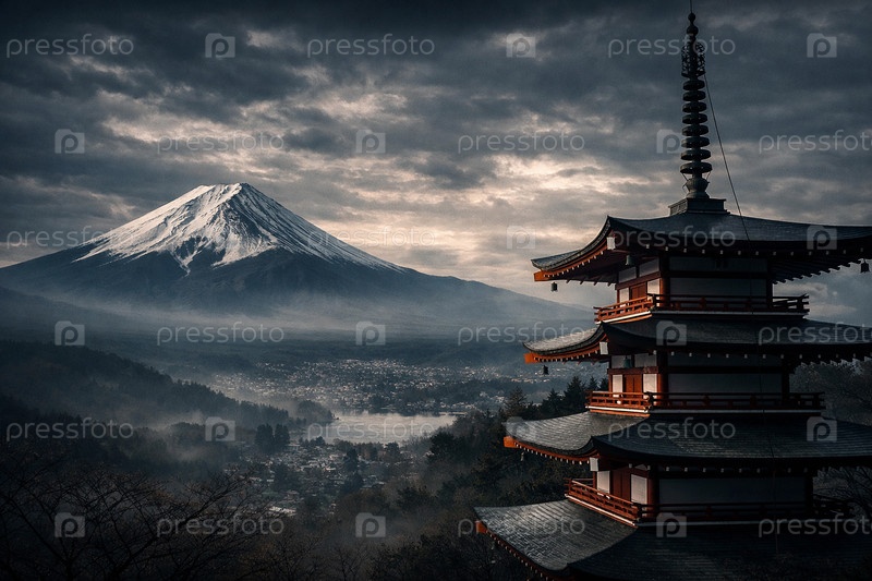 Заснеженная гора Фудзи на фоне пасмурного неба и туманной долины, традиционная японская многоярусная пагода на переднем плане, контраст архитектуры и природы в утреннем свете