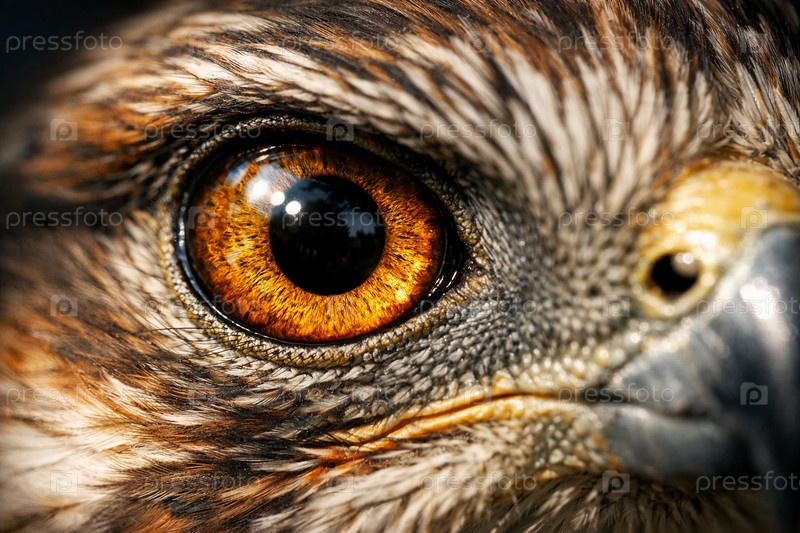 Крупный план глаза хищной птицы в макросъемке — янтарный (рыже‑оранжевый) зрачок, детальная текстура перьев и клюва, драматический портрет дикой птицы