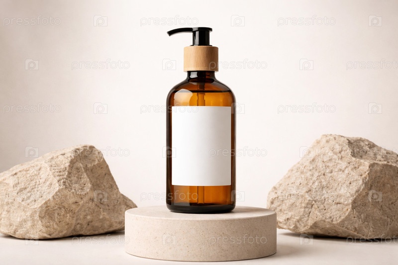 Янтарная стеклянная бутылка с дозатором и деревянной крышкой на круглой каменной подставке, мокап косметического флакона с пустой белой этикеткой на нейтральном бежевом фоне в минималистичном эко-стиле