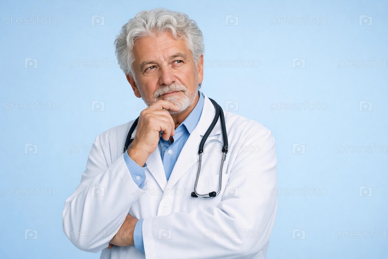 Портрет пожилого врача в белом халате со стетоскопом в задумчивой позе на светло-голубом фоне