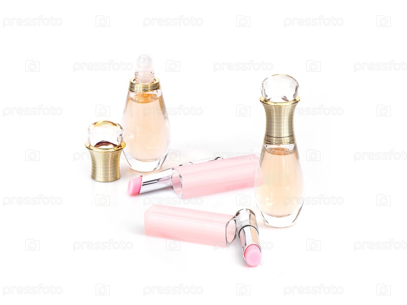Дизайн парфюмерной бутылки изолированный и розовая помада на белом фоне