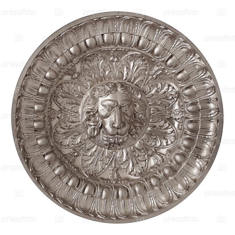 Декоративный элемент в виде серебряной головы льва, изолированного на белом фоне