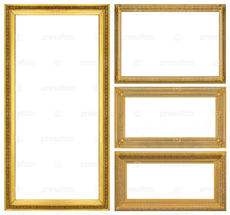 Набор золотых рамок для картин, зеркал или фотографий, изолированных на белом фоне