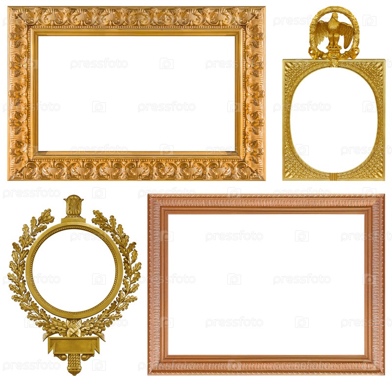 Набор золотых рамок для картин, зеркал или фотографий, изолированных на белом фоне