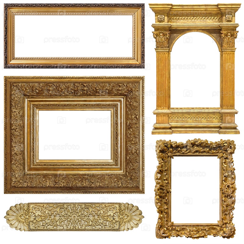 Набор золотых рамок для картин, зеркал или фотографий, изолированных на белом фоне