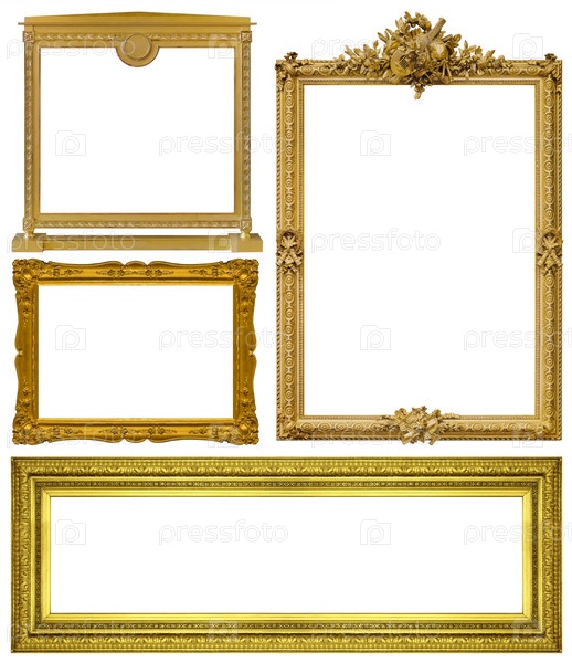 Набор золотых рамок для картин, зеркал или фотографий, изолированных на белом фоне