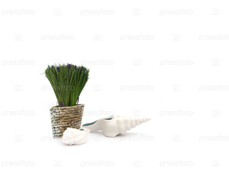 Ваза с травой и белыми моллюсками, изолированными на белом фоне