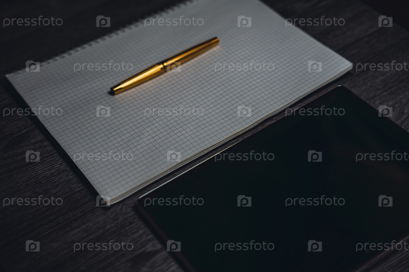Рабочее место.Ноутбук с ручкой и планшетом на деревянном столе.Строгий стиль