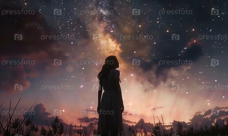 Красивая женщина в прозрачной одежде стоит на фоне космического неба