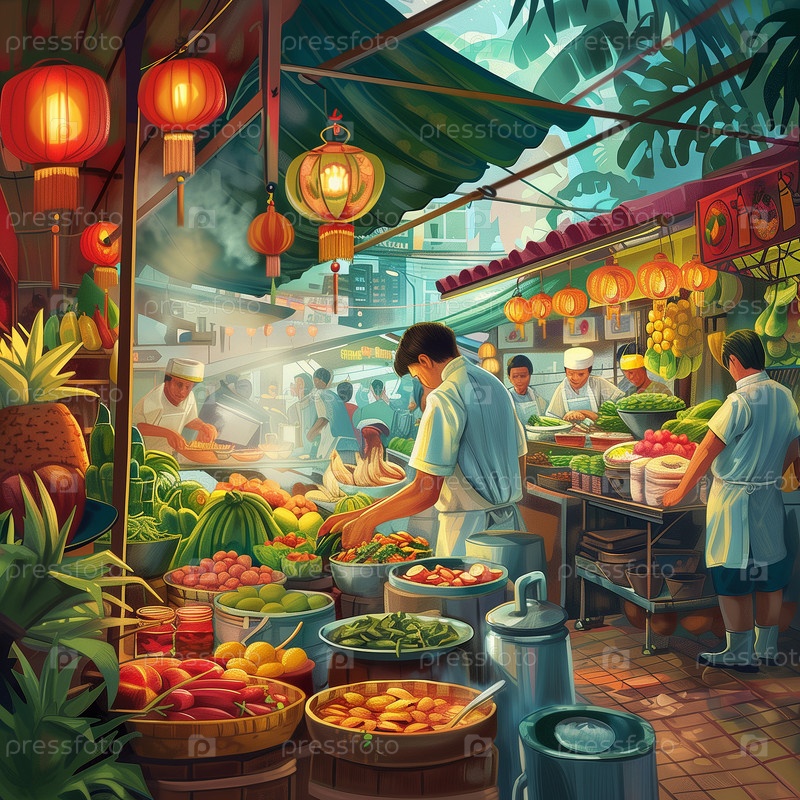 Азиатский уличный рынок еды, приготовление пищи на свежем воздухе, рынки с продуктами