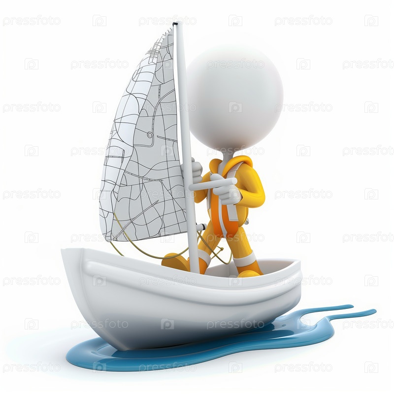 Стикмен плывет на яхте, изолированный на белом фоне