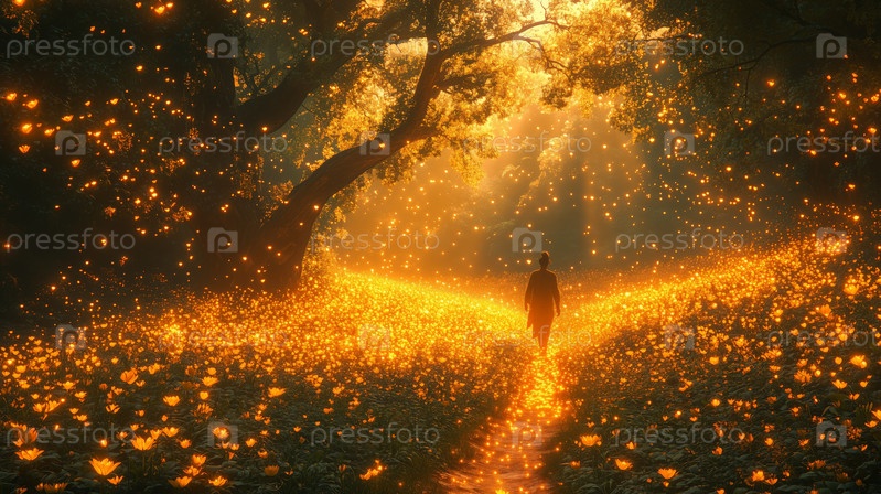 Человек, идущий по сияющему цветочному лесу под золотым светом