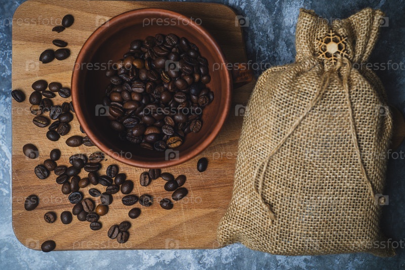 Кофейные бобы в глиняной чашке
