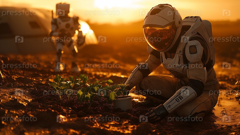 Астронавт сажает урожай на Марсе во время заката с помощью робота