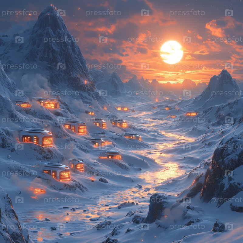 Футуристические дома в снежном лесу на закате