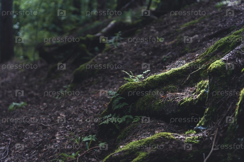 Покрытые мохом корни деревьев вдоль затененной лесной тропы
