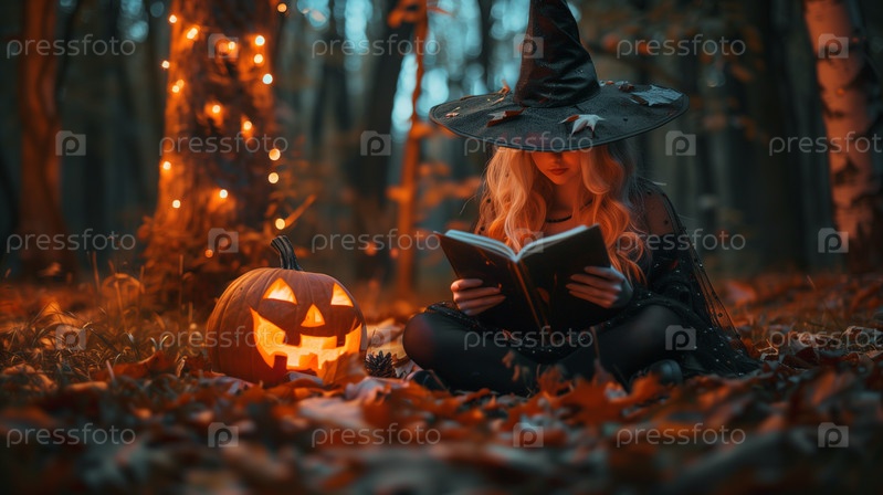 Девушка в колдовской шляпе читает книгу в осеннем лесу