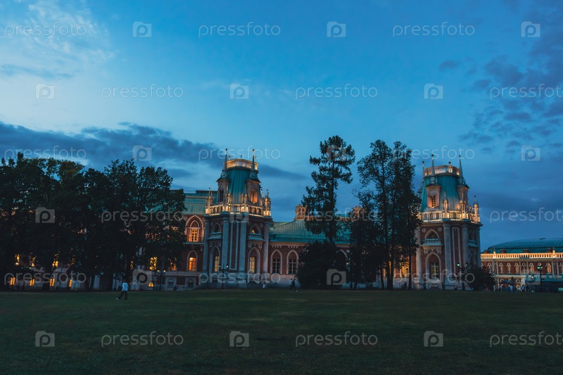 Большой готический дворец с освещенными башнями в сумерках