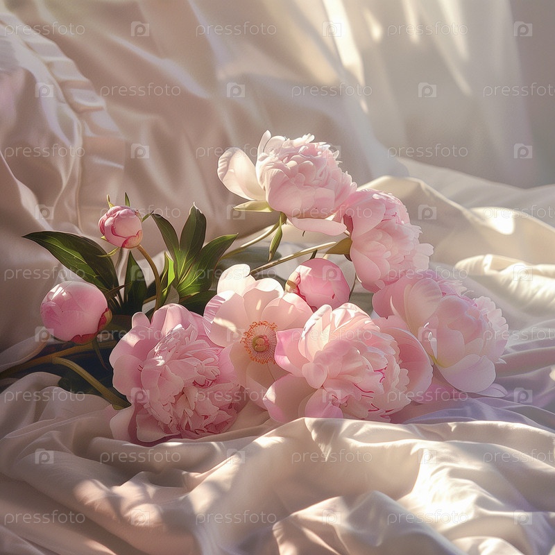 Букет белых пионьев, лежащих на кровати по утрам