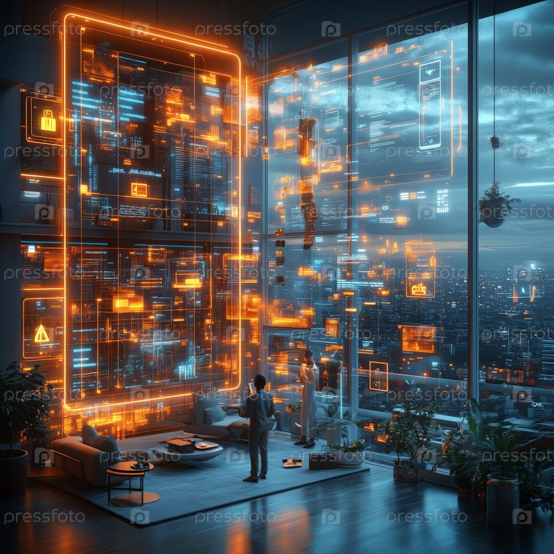 Человек взаимодействует с светящимся голографическим интерфейсом в футуристической городской квартире