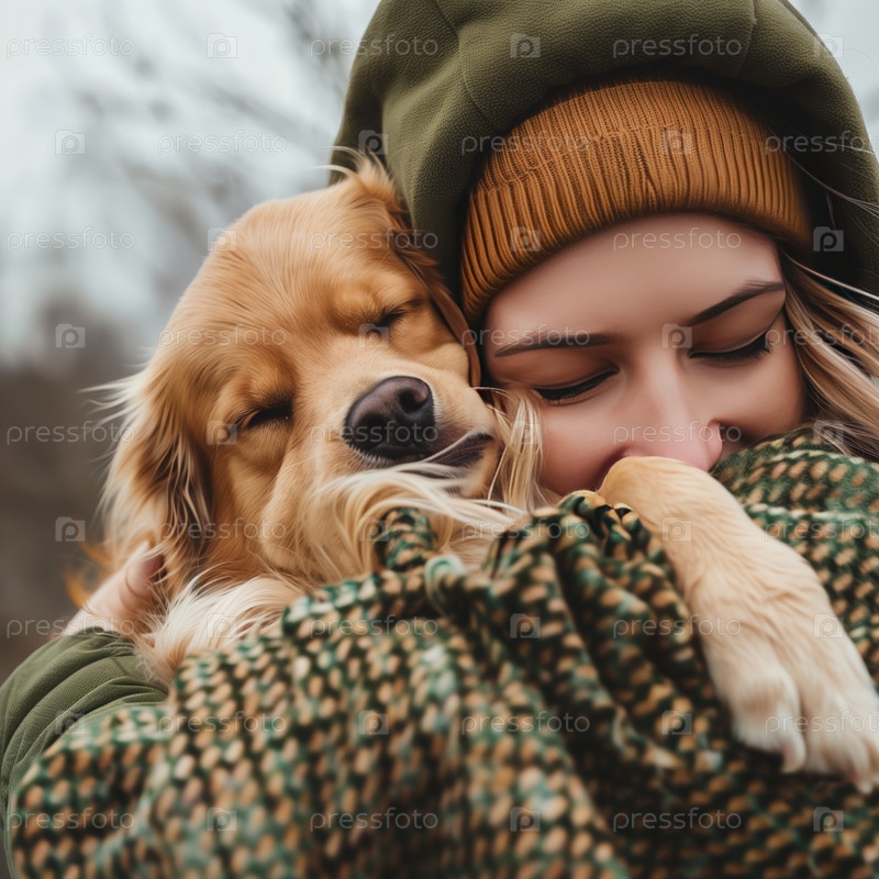 Женщина обнимает свою собаку на улице