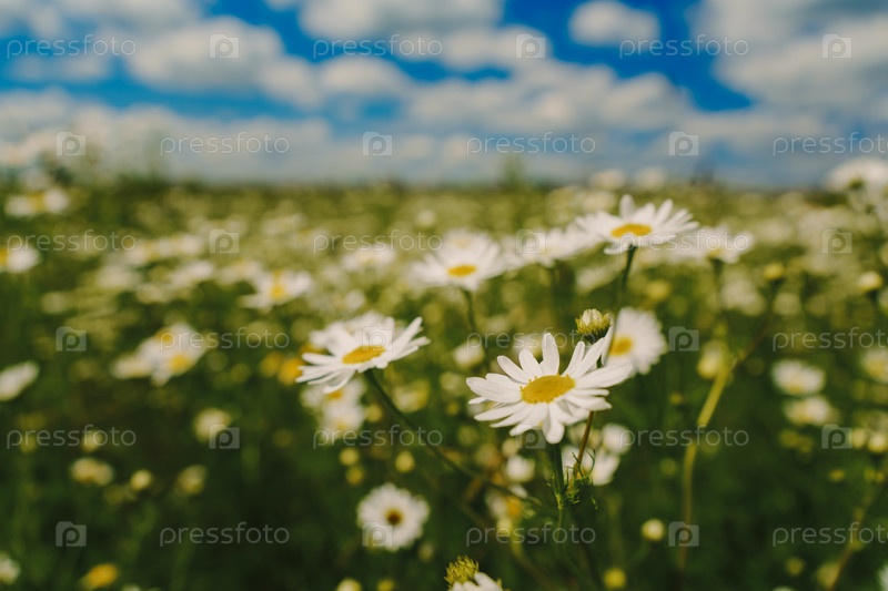 Поле цветущих ромашек под облачным небом