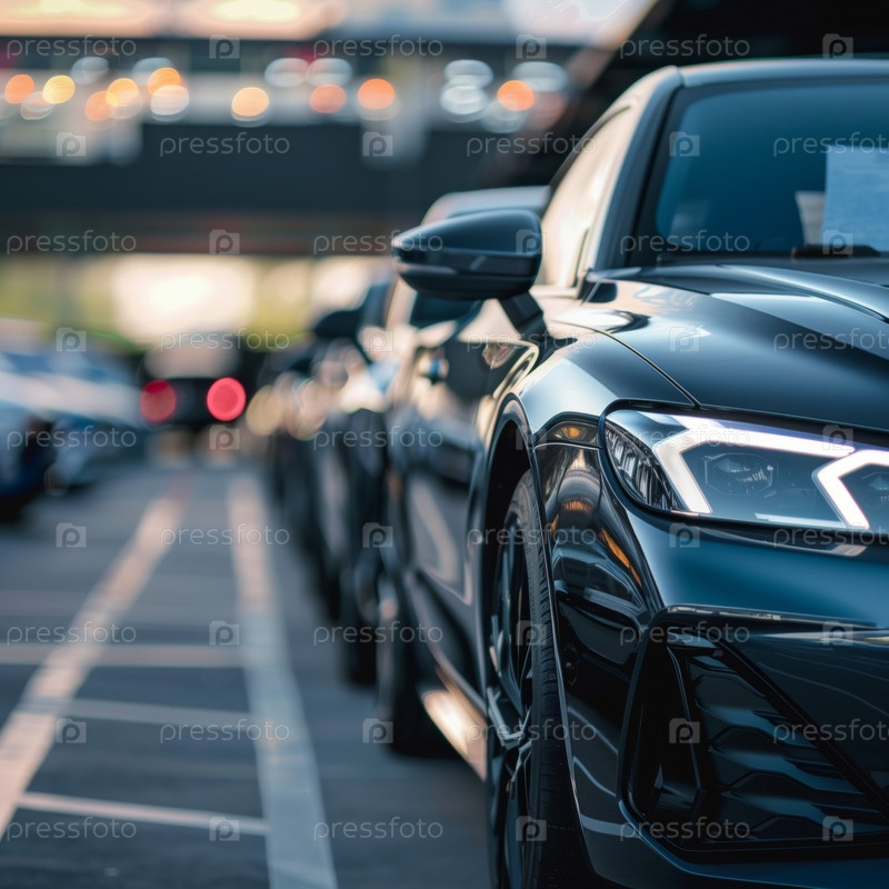 Ряд припаркованных автомобилей на открытой парковке во время заката