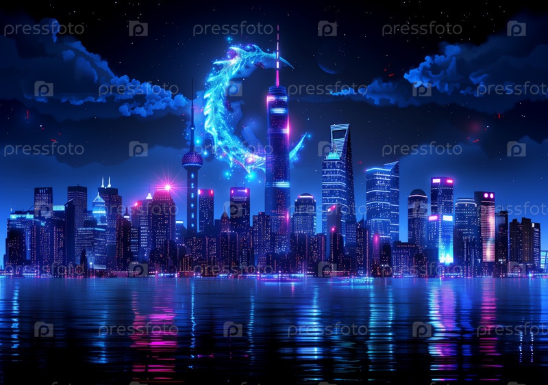 Неоновый городской пейзаж под полнолунием с отражениями на воде