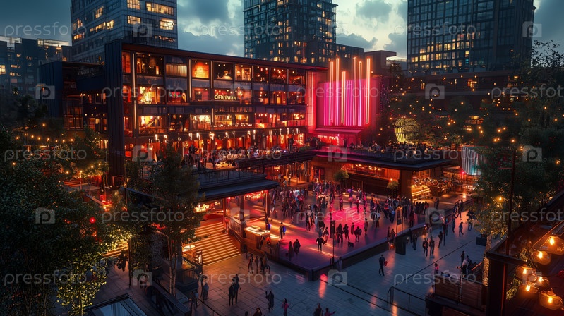 Переполненная городская площадь, освещенная яркими огнями ночью