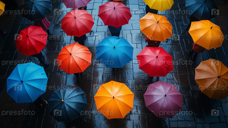 Вид с воздуха людей с красочными зонтиками на дождливой улице