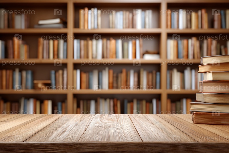 Книги на деревянном столе в библиотечной обстановке