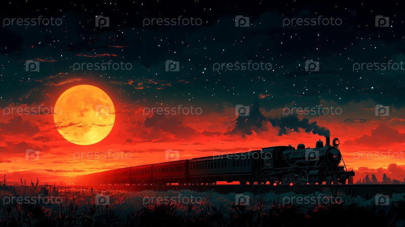 Силуэт поезда на фоне огненно-красного заката и полной луны
