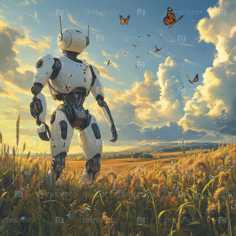 Футуристический робот, взаимодействующий с бабочками в ярком цветочном поле